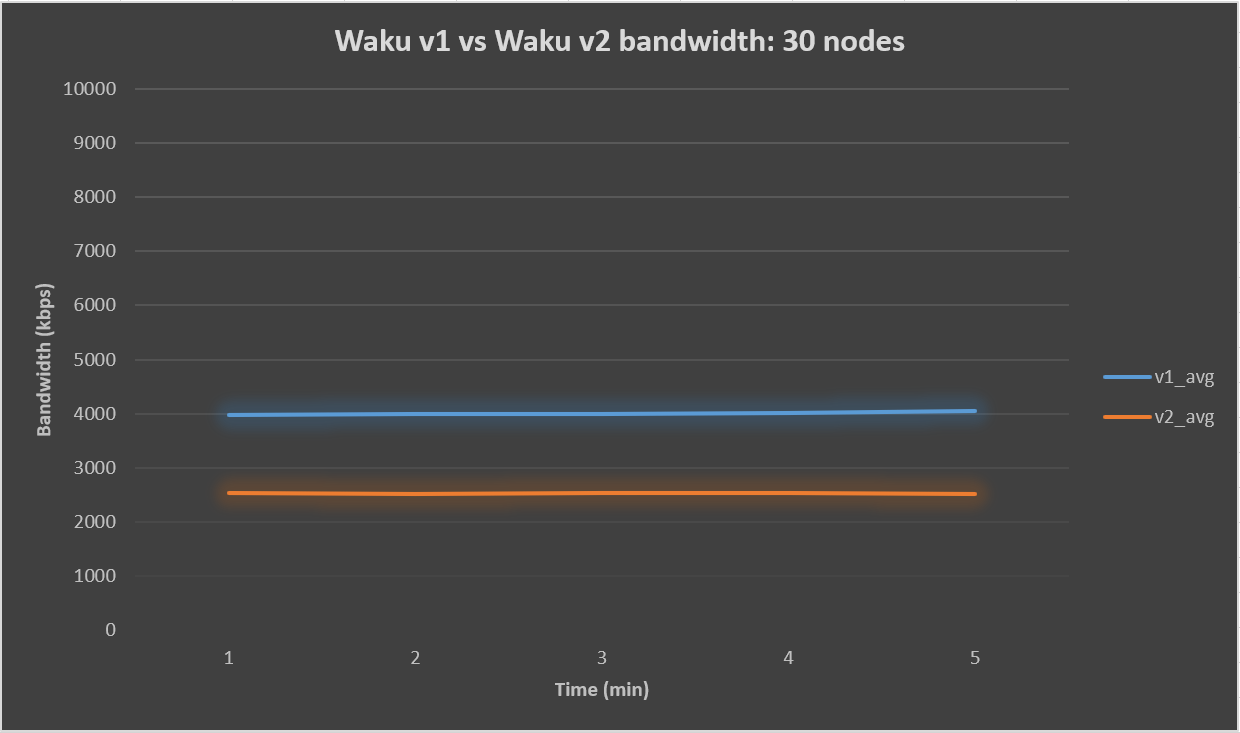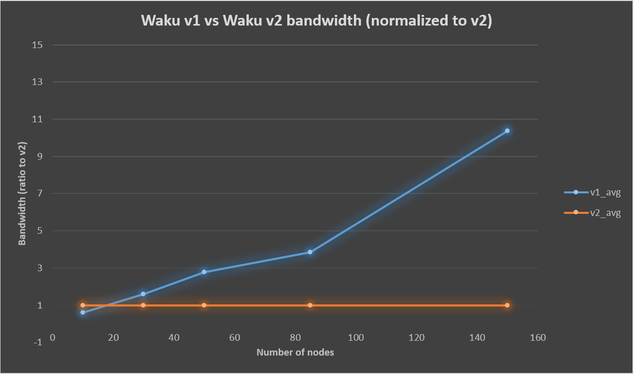 - E.g. for a network consisting of 150 or more densely connected nodes, Waku v2 provides more than 10x better average bandwidth usage rates than Waku v1.