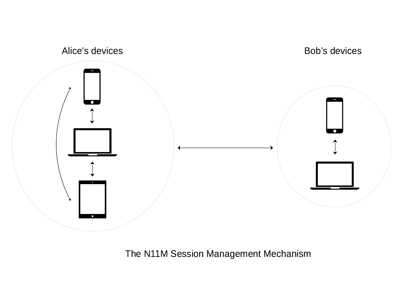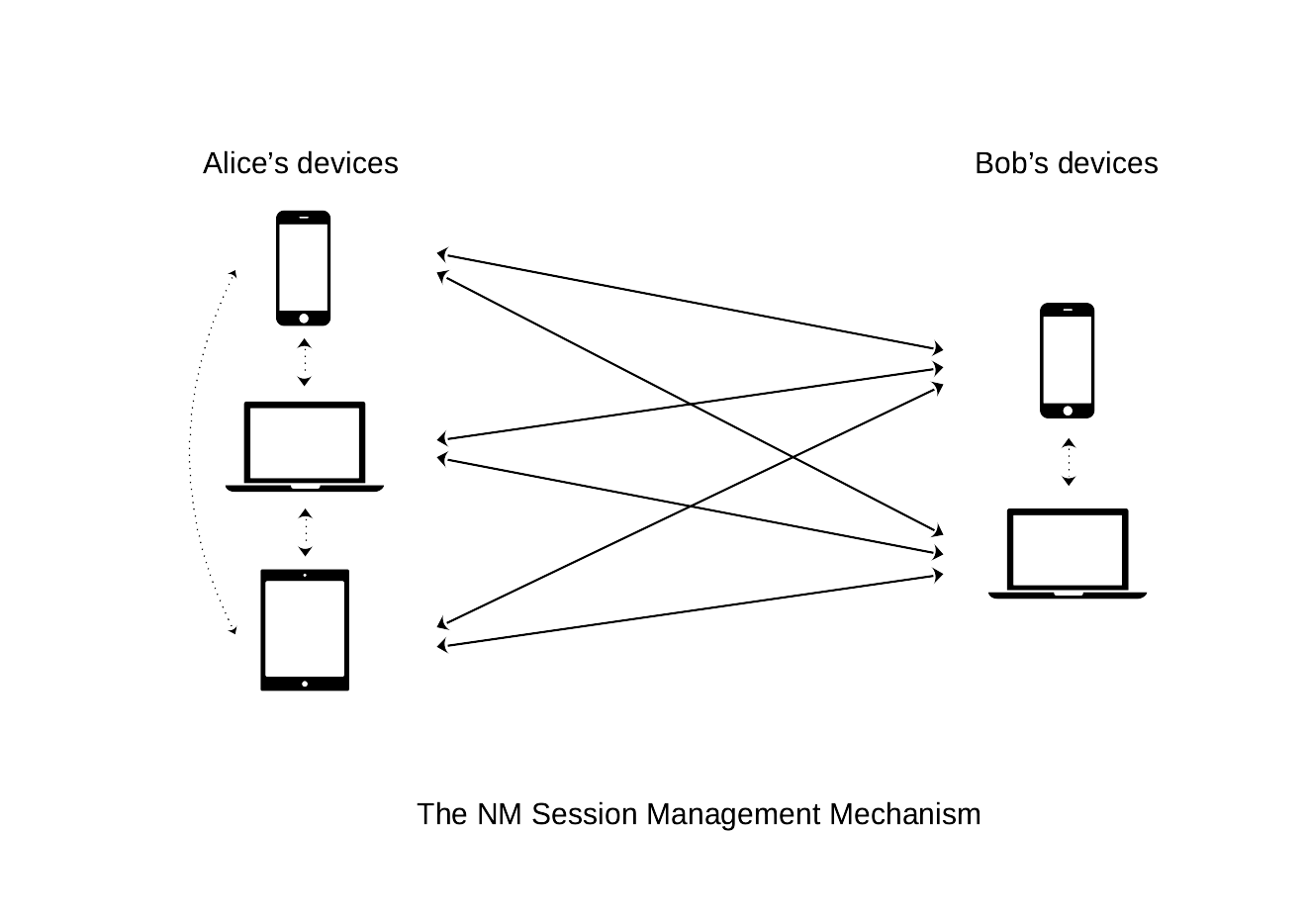 Informally, in the session management scheme, once the first Noise session between any of Alice’s and Bob’s device is instantiated, its session information is securely propagated to all other devices using previously instantiated Noise sessions. Hence, all devices are able to send and receive new messages on the content topic associated to such session.